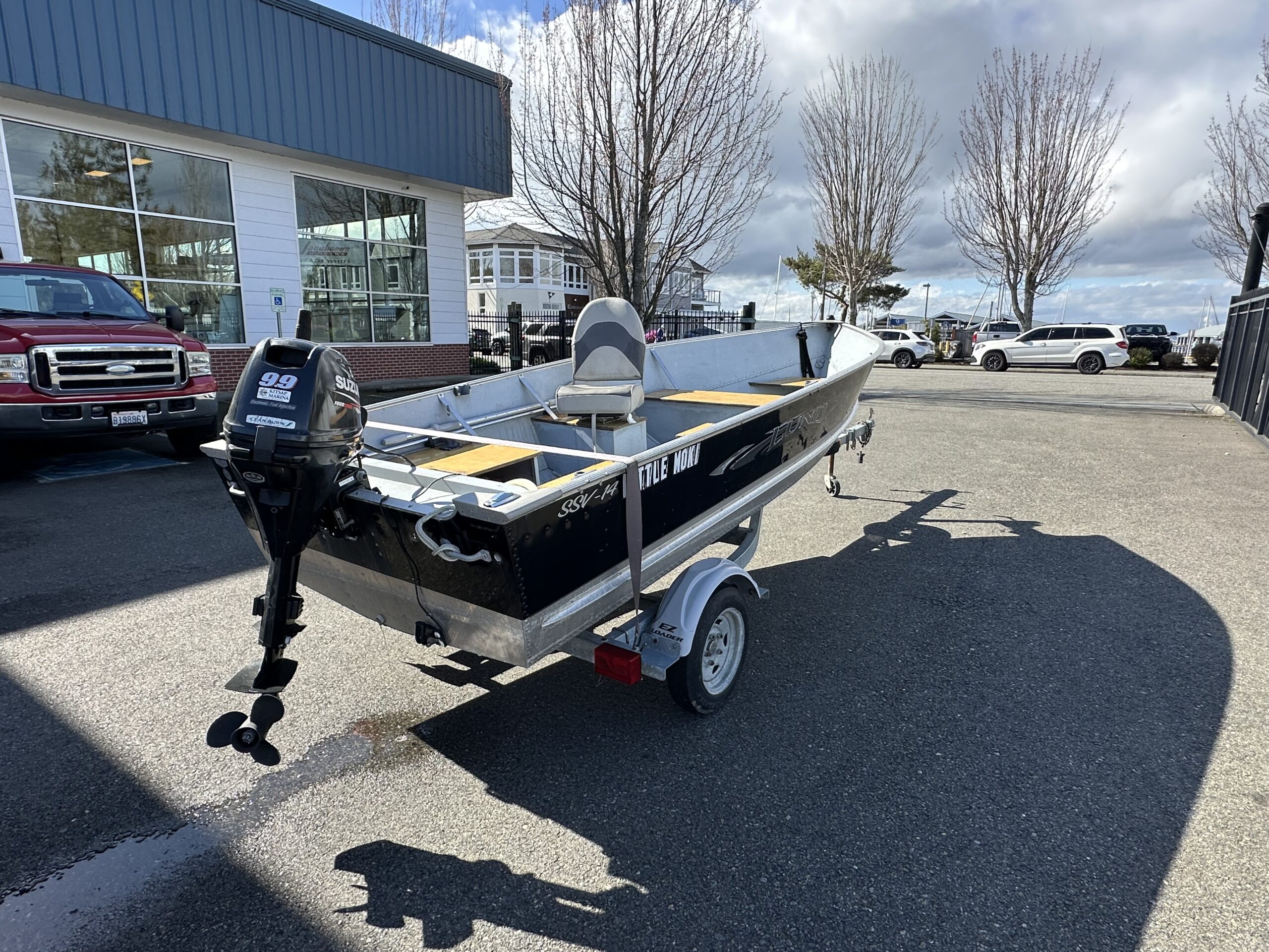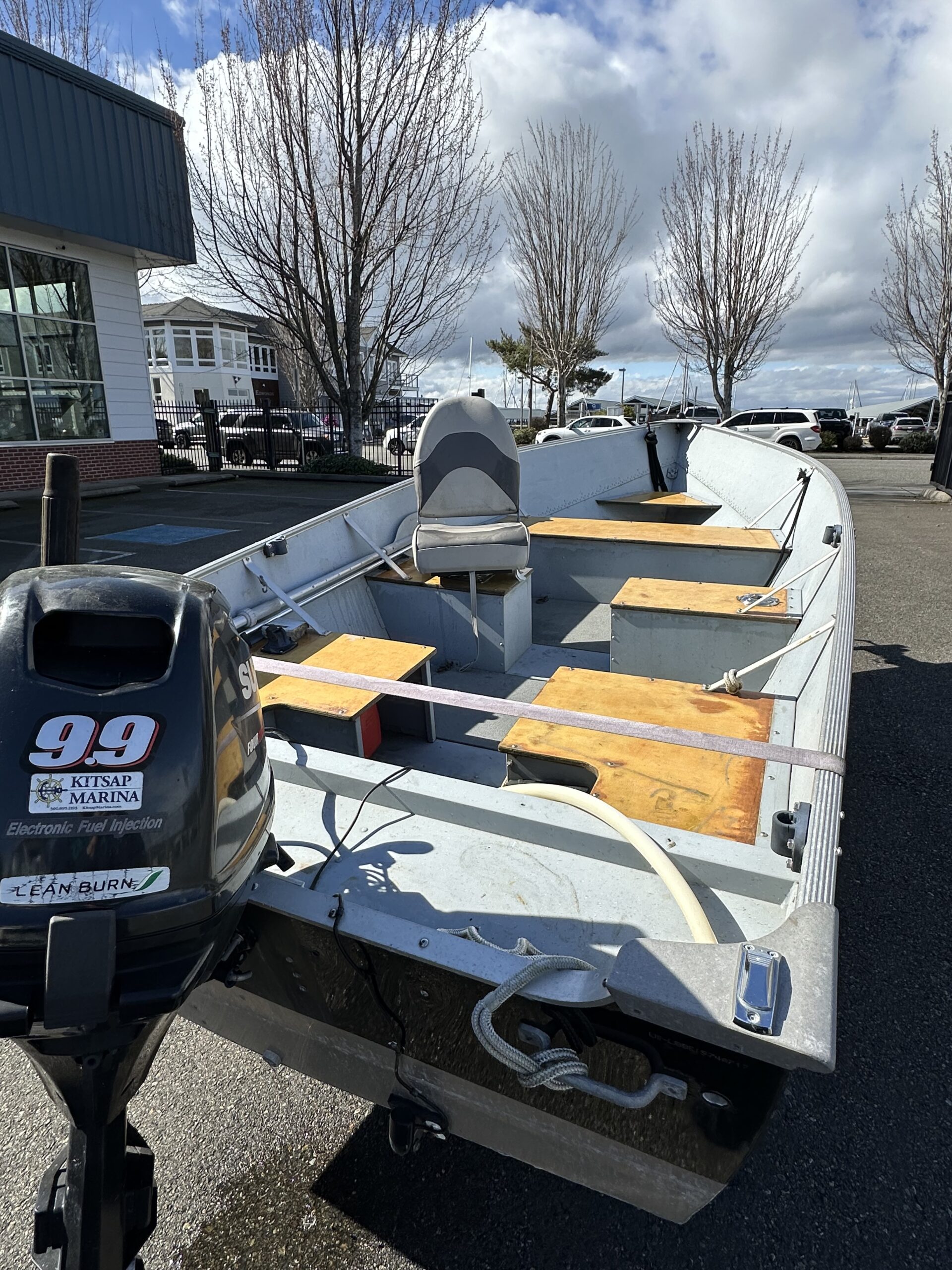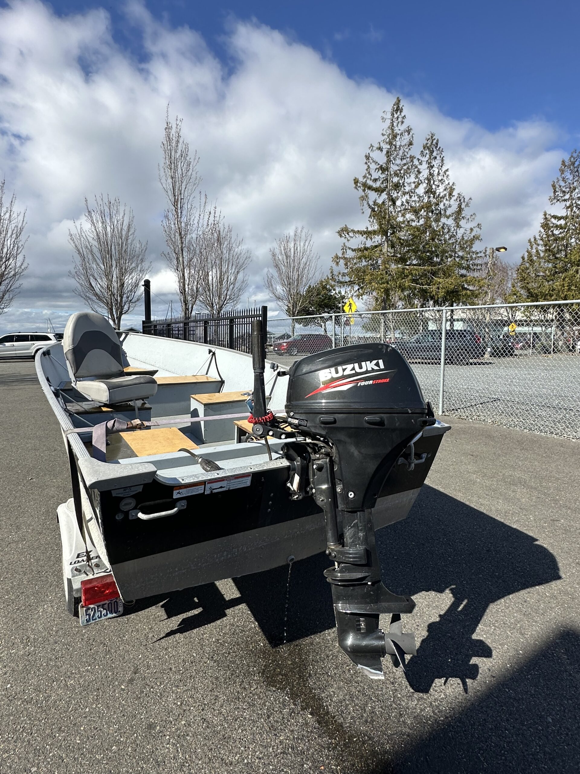 The boat has a 9.9hp Suzuki outboard.